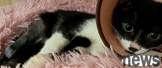 Looking at this kitten wearing an Elizabethan trap, Mr. Mew was filled with emotion. The days of being shackled are over, and what awaits it in the future will be a healthy body, a warm new home, and an owner who loves it deeply, without pain and fear.