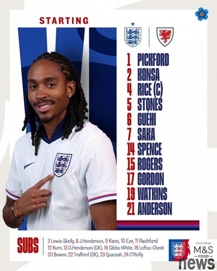 England starting lineup: 1-Pickford, 2-Konsa, 5-Stones, 6-Guey, 14-Spencer, 17-Gordon, 15-Rogers, 4-Rice, 21-Anderson, 7-Saka, 19-Watkins