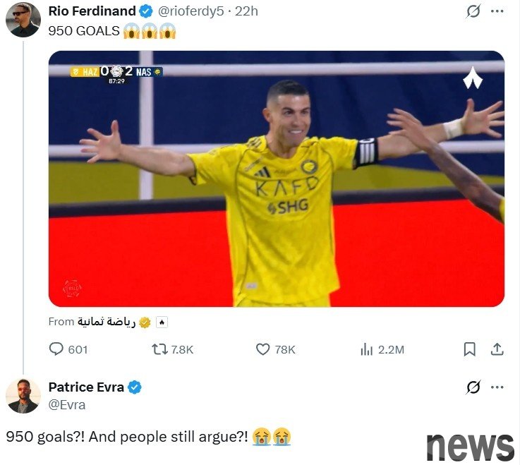 Ronaldo’s old Manchester United teammate Ferdinand posted a clip of Ronaldo’s goals and lamented: 950 goals!